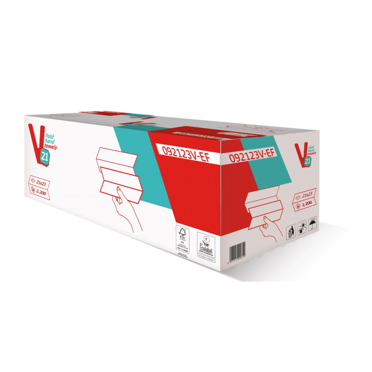 Skladané papierové uteráky do V sú vyrobené zo 100 % celulózy a vďaka 2-vrstvovému prevedeniu poskytujú vysokú savosť a pevnosť. Kompaktnejší rozmer 21 x 23 cm zabezpečuje efektívne osušenie rúk už s 1 – 2 listami, čím sa znižuje spotreba a prevádzkové náklady.